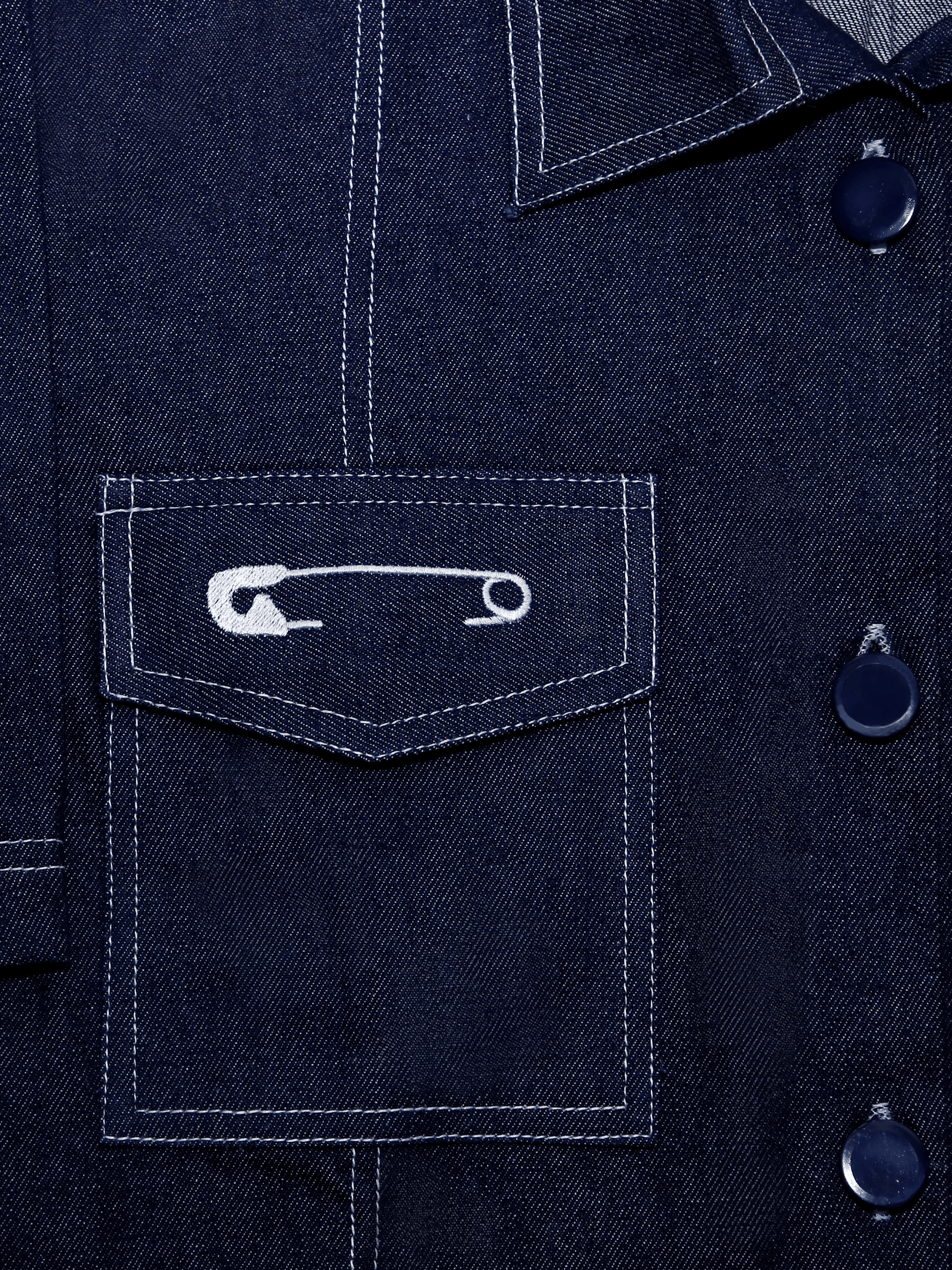 features: utility-inspired oversized pockets with embroidered safety pin detailing